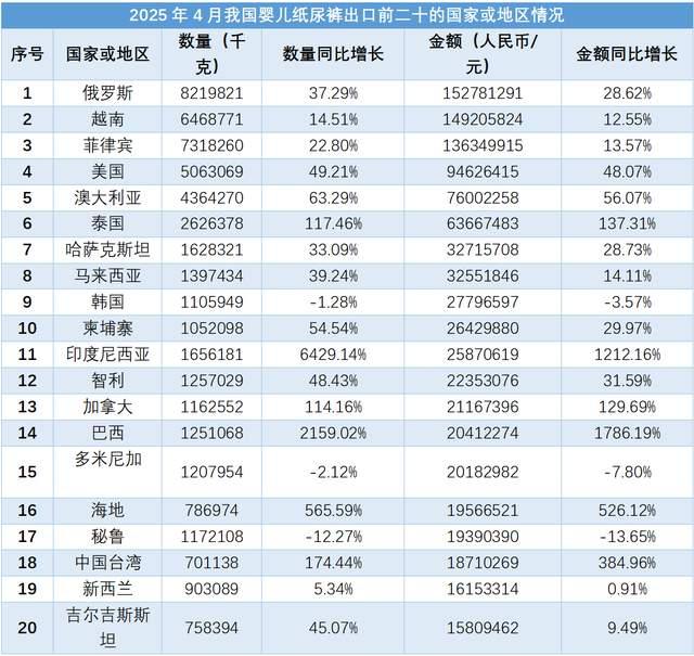 從出口目的地來(lái)看,2025年4月我國(guó)嬰兒紙尿褲出口金額前10位的國(guó)家或地區(qū)依次是俄羅斯、越南、菲律賓、美國(guó)、澳大利亞、泰國(guó)、哈薩克斯坦、馬來(lái)西亞、韓國(guó)和柬埔寨。